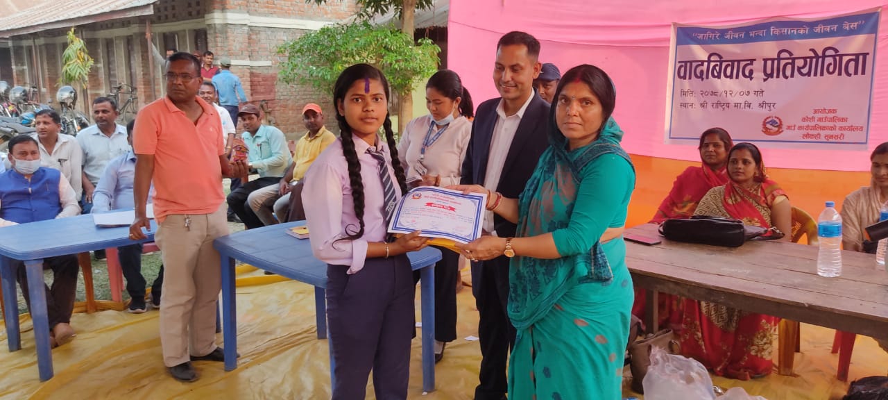 लौकही । कोशी गाउँपालीकाको आयोजनामा किसानको महत्त्व विषयक वादविवाद प्रतियोगिता सम्पन्न भएको छ । कोशी गाउँपालीका ६ स्थित रहेको राष्ट्रिय मावि श्रीपुरमा “जागिरे जीवन भन्दा किसानको जीवन बेस” भन्ने विषयमा विद्यालयस्तरीय वादविवाद सोमबार सम्पन्न भएको हो । वादविवाद प्रतियोगिता कोशी गाउँपालीकाकी उपाध्यक्ष अनिता यादवको प्रमुख आतिथ्य तथा राष्ट्रिय मावि श्रीपुरका प्रधानाध्यापक जयप्रकाश यादवको अध्यक्षतामा सम्पन्न भएको थियो ।