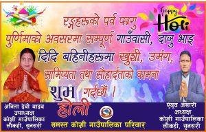 इनरुवा । कोसी गाउँपालीका अध्यक्ष एक नेपाली कांग्रेस सुनसरी क्षेत्र नम्बर ४ का सभापति ऐयुब अन्सारीले होली पर्वको अवसरमा शुभकामना दिएका छन् । हाल उमराह गर्न साउदी अरबमा रहेका उनले अत्यन्त हर्षोल्लासका साथ खेलिने होली पर्वका अवसरमा सामाजिक संजालमार्फत सबैमा शुभकामना व्यक्त गरेका छन् । रङ्गको पर्व होलीको उपलक्ष्यमा सम्पुर्ण दुखेका, नदुखेका मनहरुमा सुख -शान्ति- समृद्धि तथा उत्तर उत्तर प्रगतिको शुभकामना दिन चाहन्छु उनलेे सामाजिक संजाल फेस्बुकमा लेखेका छन् ।