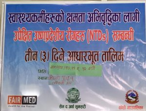 सो तालिममा कुष्ठरोग (Hansens Disease /social Disease ),हात्ती-पाइले रोग (Lymphatic filariasis),माटोबाट सर्ने जुका (Soil-Transmitted Helminthes),डेंगी (Dengue) and F चकनगुनिया,रेबिज (Rabies),सर्पदंश (snakebite Envenoming), लुतो (Scabies and other Ectopprasite ), कालाजार (Leishmaniasis / kala-azar),फिते जुका (Taeniasis / cystricercosis), खस्रे रोग (Trachoma) रोग लाग्ने कारण र बच्ने उपाय,अपनाउनुपर्ने सावधानी यावत विषयमा सहभागीहरुलाई जानकारी गराइएको थियो ।