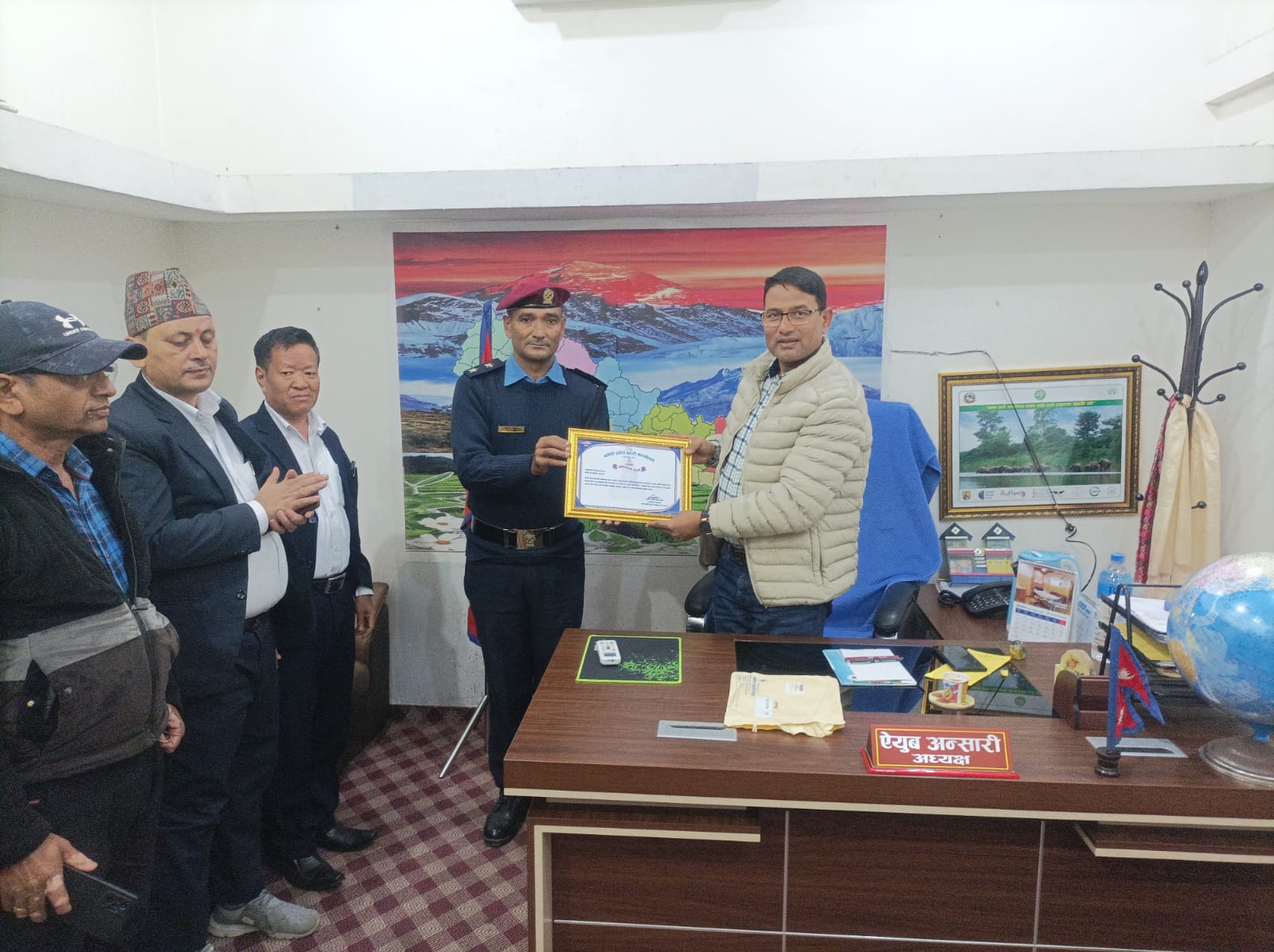 यता कोशी गाउँपालीका अध्यक्ष ऐयुब अन्सारीलाई नेपाल प्रहरीले उहाँले गर्नुभएको सहयोगको उच्च मूल्यांकन गरी सम्मान गरेकोमा प्रमुख प्रशासकीय अधिकृत दिलशेर राईले कोशी प्रदेश प्रहरी कार्यालय बिराटनगरलाई धन्यवाद दिए । सम्मानपत्र हस्तान्तरण कार्यक्रममा कोशी गाउँपालीकाका प्रमुख प्रशासकीय अधिकृत दिलशेर राई,लेखा अधिकृत सूरप्रसाद दंगाल,स्वास्थ्य शाखा प्रमुख रामनाथ साह, कोशी गाउँपालीका अध्यक्ष ऐयुब अन्सारीका स्वकीय सचिव धर्मेन्द्र विश्वास लगायतको उपस्थिति रहेको थियो ।