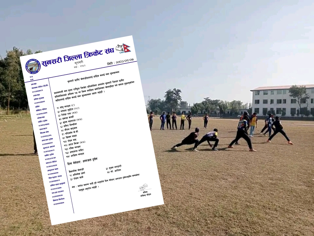 इनरुवा । प्रधानमन्त्री कप पुरुष राष्ट्रिय क्रिकेट प्रतियोगिताको लागि सुनसरीबाट १४ जना खेलाडी छनोट गरिएको छ । प्रधानमन्त्री कप पुरुष राष्ट्रिय क्रिकेट प्रतियोगिता अन्तर्गत सुनसरी जिल्ला छनोट प्रतियोगिताबाट सोनू मण्डलको नेतृत्वमा अन्तिम १४ जना खेलाडी छनोट गरिएको हो ।