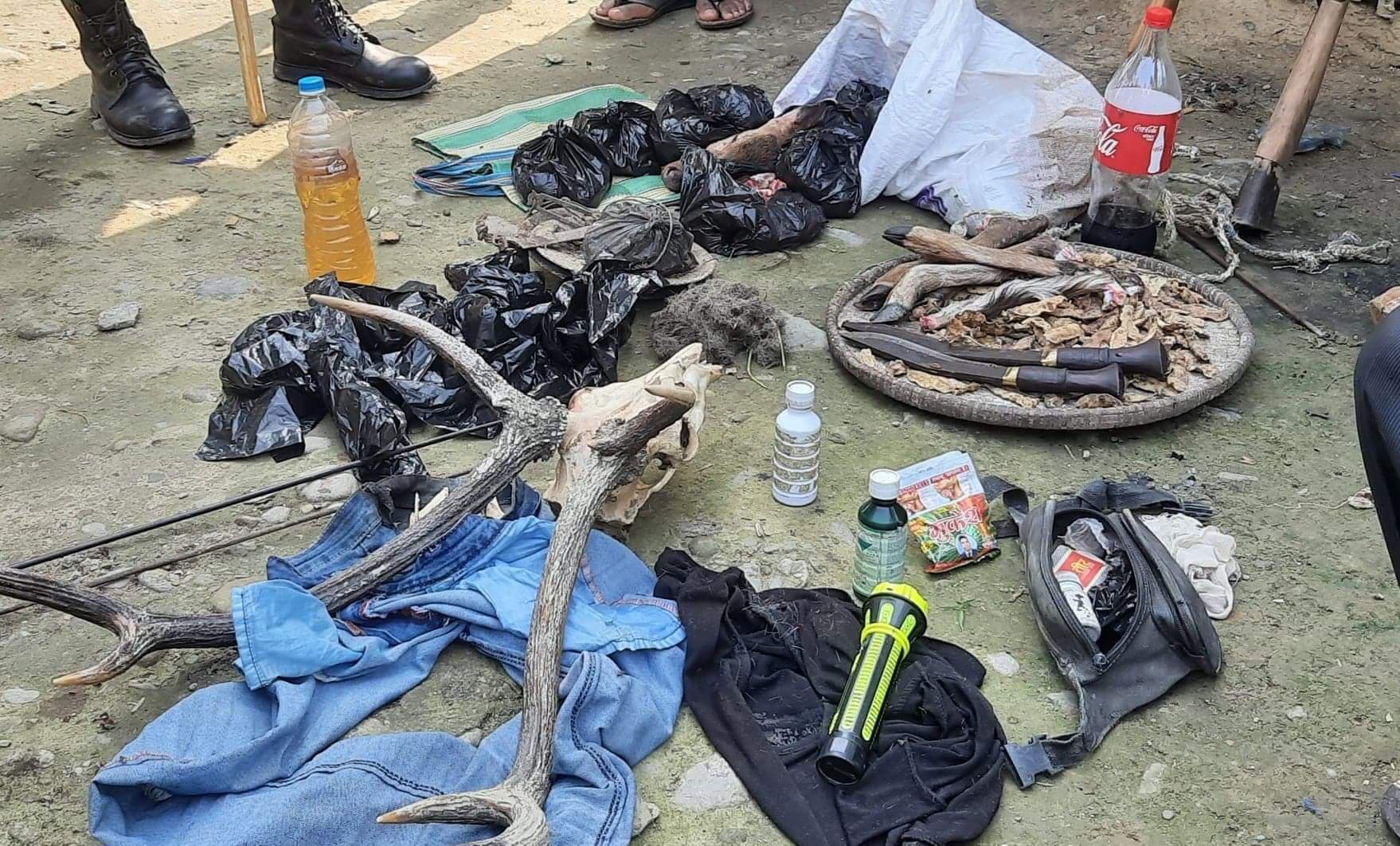 शुक्रबार बिहानै प्रहरीलाई जंगलबाट हरिण मारेर ल्याई घरमा काटिरहेको भन्ने सूचना प्राप्त हुनसाथ प्रहरीले बराहक्षेत्र २ रेललाइन स्थित निरज घिमिरेको घरमा काटेको हरिणको मासु १२ किलो, हरिणको सिङ, टाउको सहित घरमै लुकाइ राखेको ३ नाल भरुवा बन्दुक, बारुद १०० ग्राम र खुकुरी सहित सोहि स्थान बस्ने २५ बर्षका एसुब राना मगर र २५ बर्षिय सागर मगरलाई प्रहरीले नियन्त्रणमा लिई थप अनुसन्धान गरिरहेको प्रहरीले जनाएको छ ।