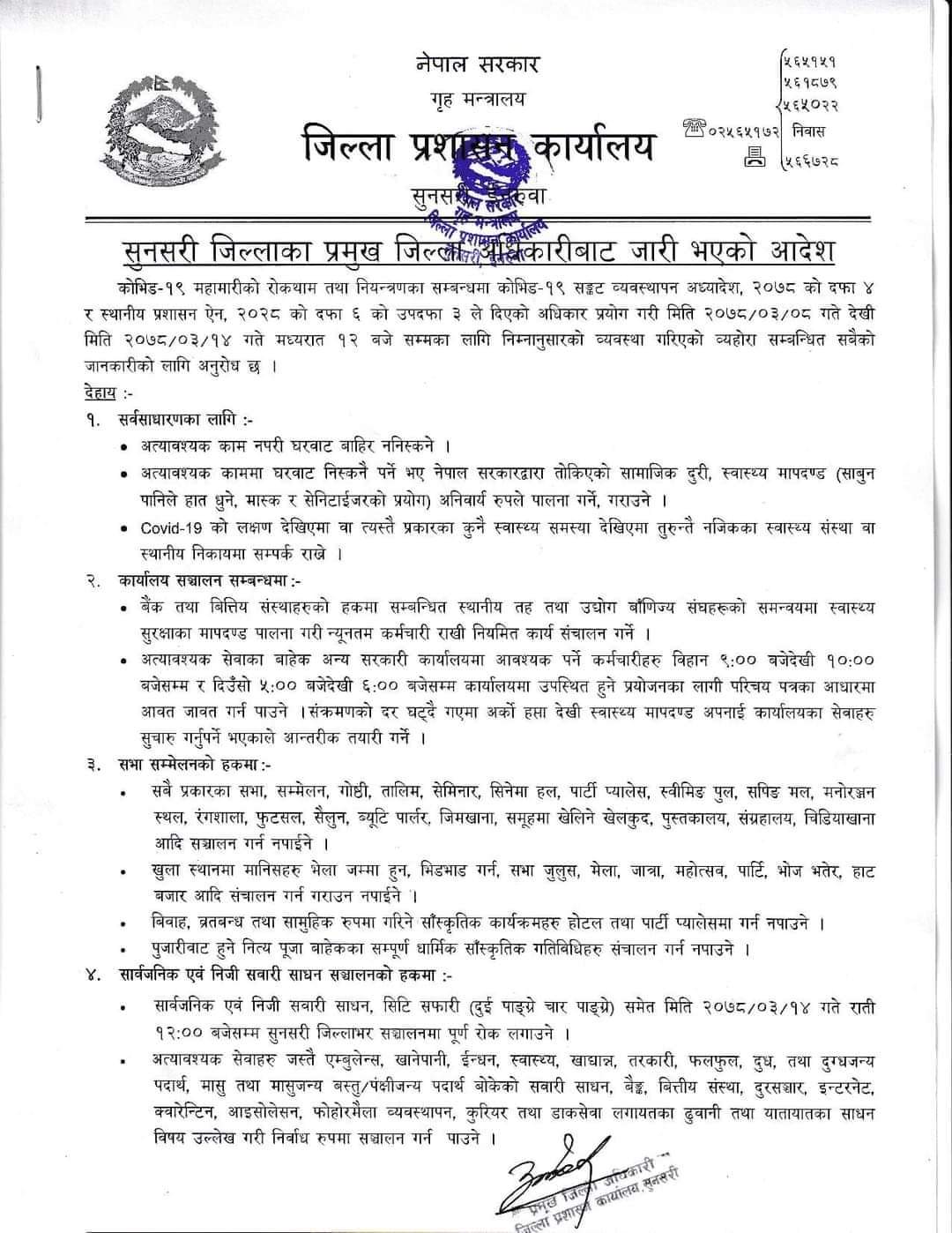 सुनसरी प्रशासनले दुधडेरी, सब्जी, खाद्यान्न, पशुजन्य आहार ढुवानीका साथै कृषि कार्य, उद्योग कलकारखाना, विकास निर्माण कार्य, ढुवानीका साधन भने निर्वाध सञ्चालन गर्न पाईने निर्णय भएको जिल्ला प्रशासन कार्यालय सुनसरीले डीसीसीएमसीको बैठकपश्चात् जारी गरेको विज्ञप्तिमा उल्लेख छ । अन्य निर्णयको हकमा भने यस अघिको सरह लागु रहनेछ । बैठकको पछिल्लो निर्णयसँगै सुनसरीमा जारी निषेधाज्ञाको अवधि भने असार १४ गतेसम्म बढाइएको छ ।